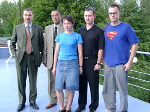 Президент НОФМО А.Д. Богатуров (слева) и слушатели-призеры Института (слева направо): Бахтияр Эргашев (Ташкент), Светлана Горькова (Иркутск), Валерий Резников (Харьков), Федор Войтоловский (Москва)